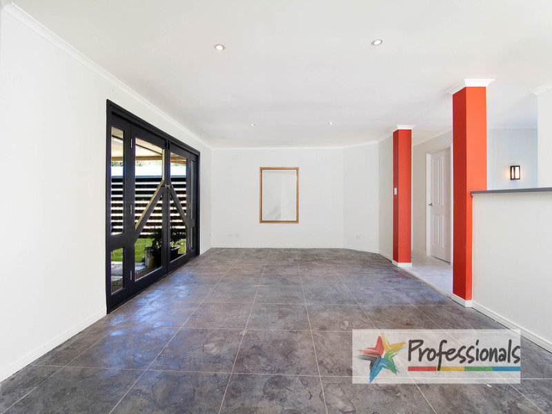 The entry foyer opens onto the first of two living spaces. Flanked by columns and designed with custom built French doors and poured concrete flooring, the lounge opens onto the covered patio and spacious backyard. The kitchen, which includes a generous pantry, opens onto the family room and dining room. This space has sliding doors to access the patio and a reverse cycle air conditioner.