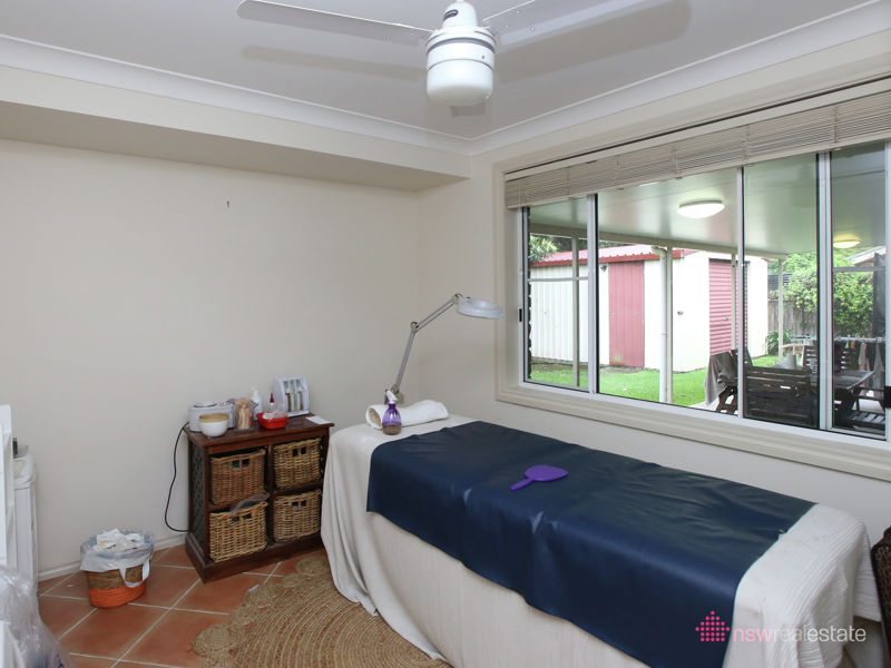 The tile continues in the converted garage. Currently being utilised as a 4th bedroom this space could also serve as a 2nd living space or rumpus room. With finishing details such as window coverings and cornice it is a welcome extension to this family home.